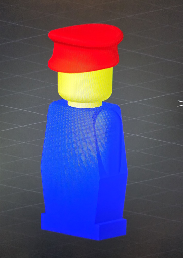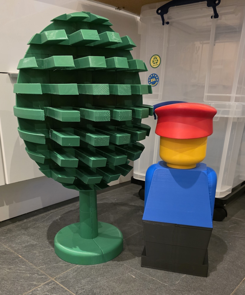 One of our members, Ian, has an awesome hobby and that hobby is 3D printing. While we were putting together our new big layout we paid a trip to Ians house to raid his parts boxes for vintage pieces and whilst we were there we got a tour of the Lego / Printing room. We noted how good his models are and that it could be really cool to be able to have some upscaled printed models of the vintage parts. We settled on a selection of the vintage “stiff” figures and a tree. Initially we thought it could be really cool to have the figures appropriately sized that children could have a photo taken stood next to them, but we we scaled this to the tree, we realised that it was going to be incredibly large, so it was settled on a 10x scale for all.