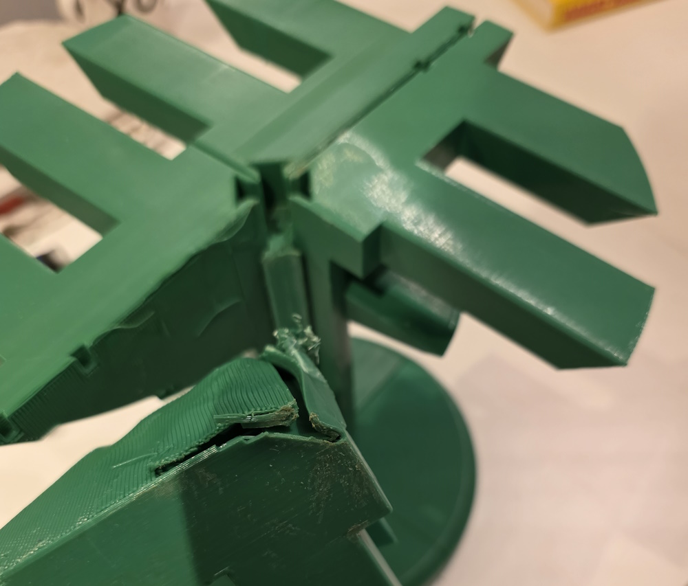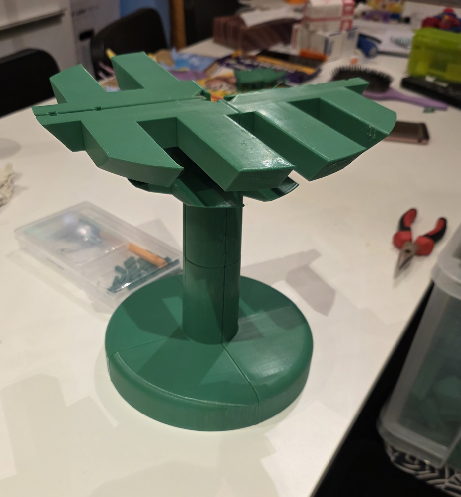 The figure parts needed to be drawn in CAD and as I use this on a regular basis I took on the challenge of designing the parts needed. The tree has been designed to be printed in sections and slots together using wedges and supports (also printed). The first attempt did not go too well during assembly and I got everything wedged in the wrong place. We managed to get it apart and some tweaks to the files and a reprint of the support bars resulted in a much easier assembly.