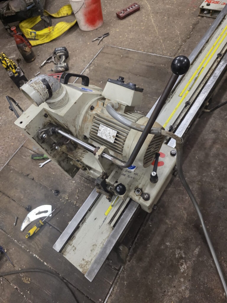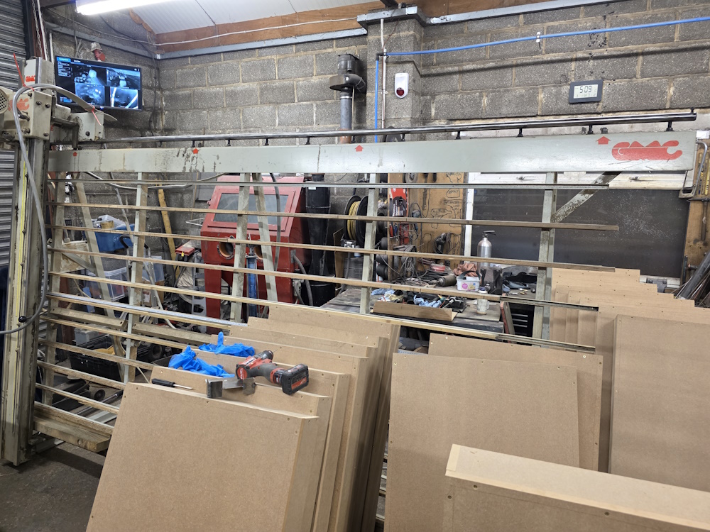 During our initial costing of the MDF and cutting fees it became apparent that the cost of cutting was going to be quite high. I looked around for a better deal and whilst I was looking I happened upon a large industrial panel saw for sale on ebay that was incredibly cheap. After speaking to the seller it was cheap because it required a number of repairs to make it usable. As an automotive engineer this didnt phase me, so a grand total of £105 was paid for it, James and I went on a Monday roadtrip to collect it – his van is bigger than mine and it should fit in.. we may have had to dismantle the door lock to get it in the back, but it fitted! Back at my workshop over the christmas break I spent about a week of my holiday dismantling, machining, welding, hammering and gave the saw a general refurb. After it was all back together it worked a treat, apart from I was missing a blade! Blade sorted and we were ready to get cutting!