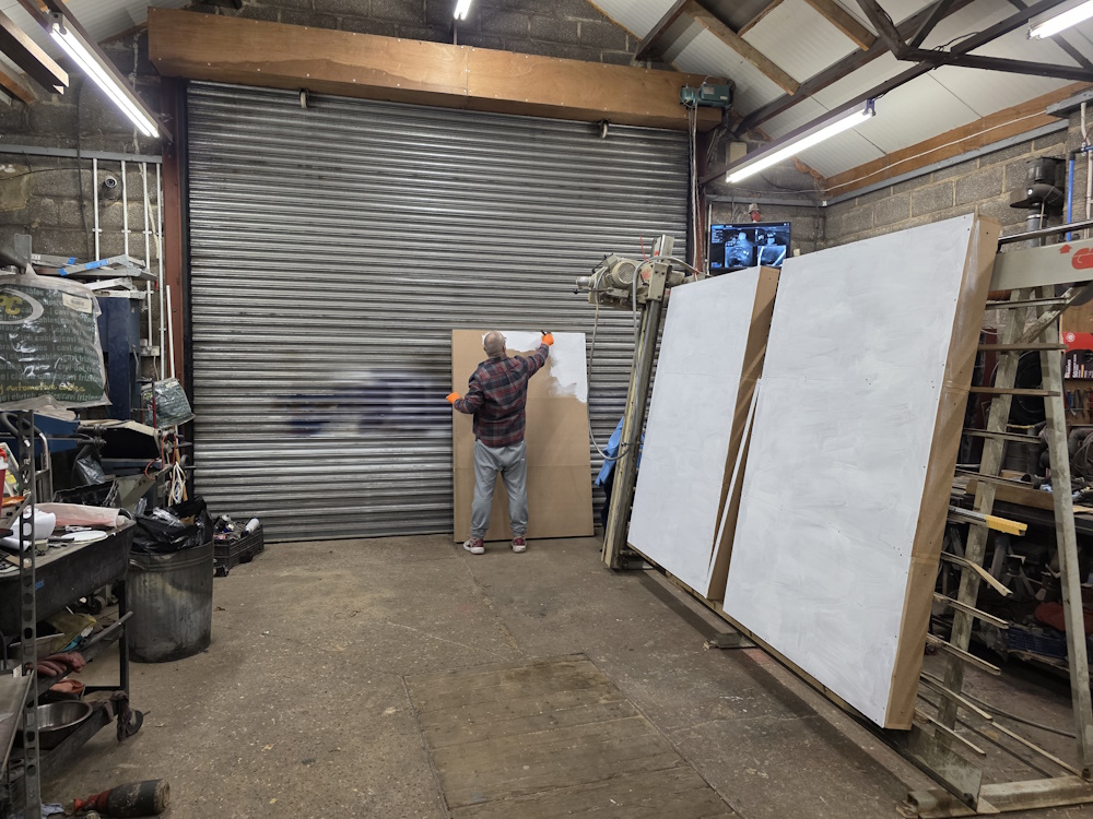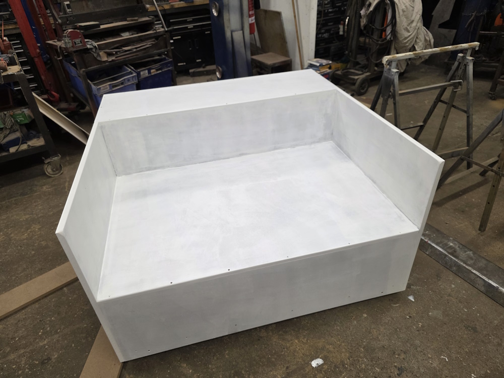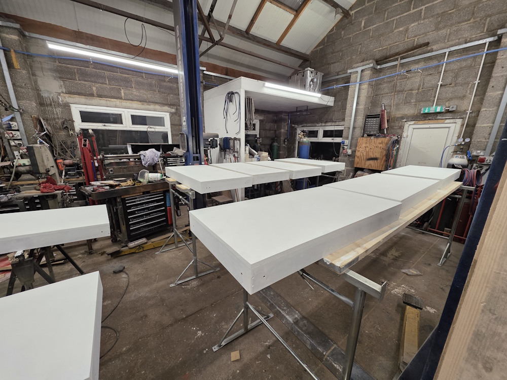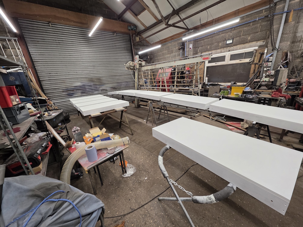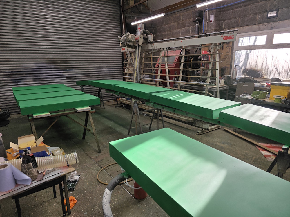 Ian came over for the day and we blitzed through the 12 sheets of MDF and by the end of the day we had a few large piles of cut pieces! The next morning James arrived and we began assembly of the table tops. We got everything together and then the 3 of us started laying out for the paintwork.